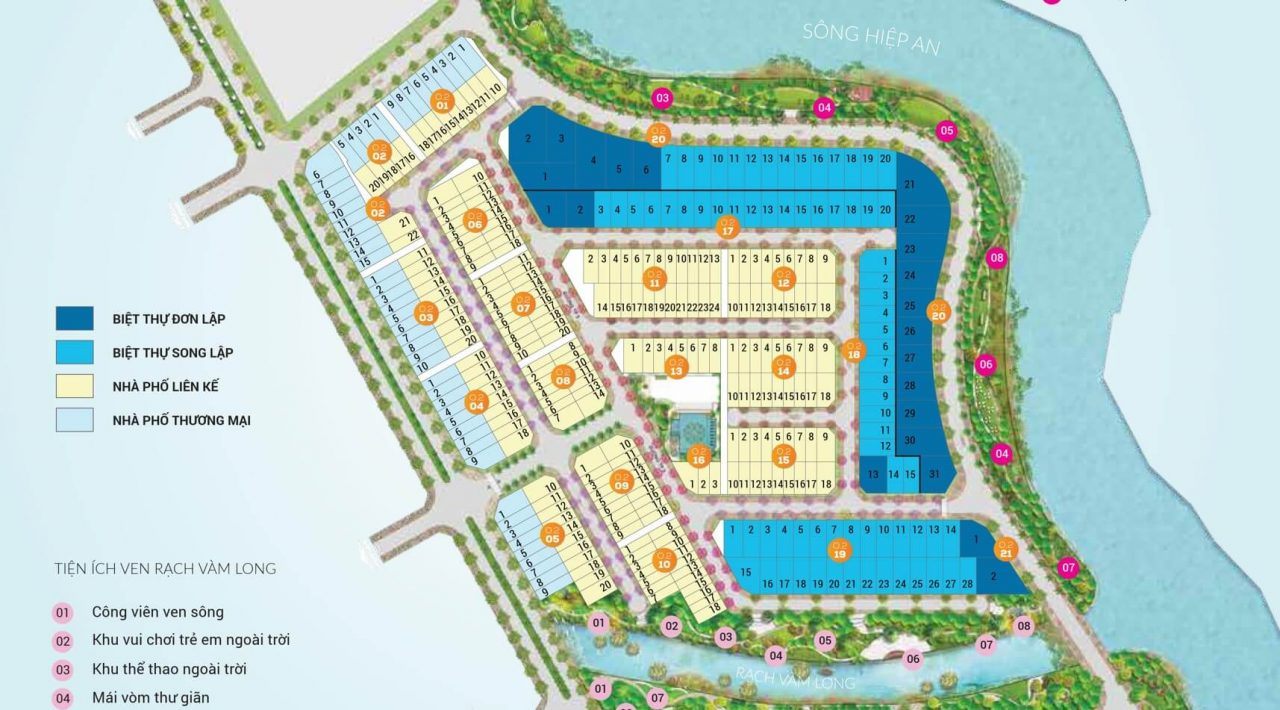 Các sản phẩm được bố trí hài hoà cùng cảnh quan xanh, thiết kế bao bọc bởi các con sông và hệ thống kênh rạch. Nhờ đó hứa hẹn mang lại không gian sống xanh trong lành cho gia chủ.