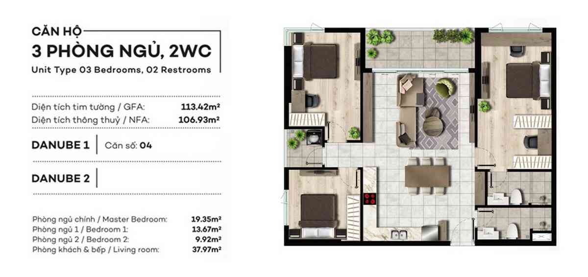 – Căn hộ loại 3 Phòng ngủ, 2 WC ( 113.42 m2 ): Không nội thất – 12,5 triệu/tháng; Nội thất cơ bản – 14-14,5 triệu/tháng